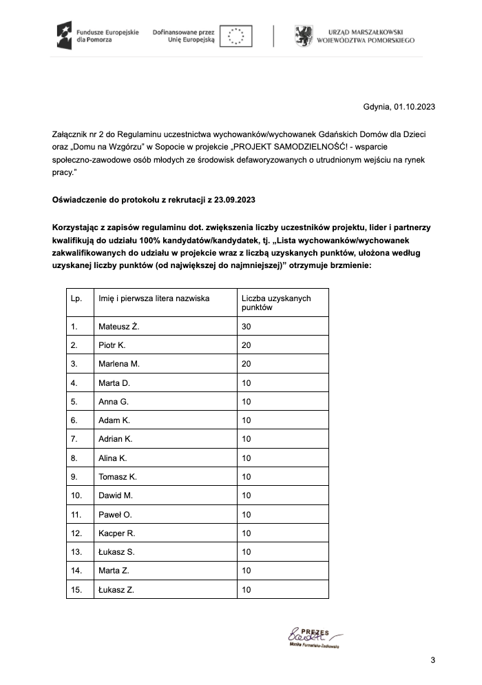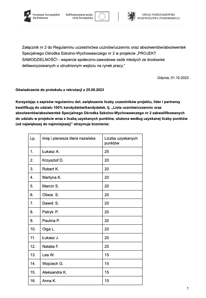 Korzystając z zapisów regulaminu dot. zwiększenia liczby uczestników projektu, lider i partnerzy kwalifikują do udziału w Projekcie „PROJEKT SAMODZIELNOŚĆ! - wsparcie społeczno-zawodowe osób młodych ze środowisk defaworyzowanych o utrudnionym wejściu na rynek pracy.” 100% kandydatów/kandydatek!