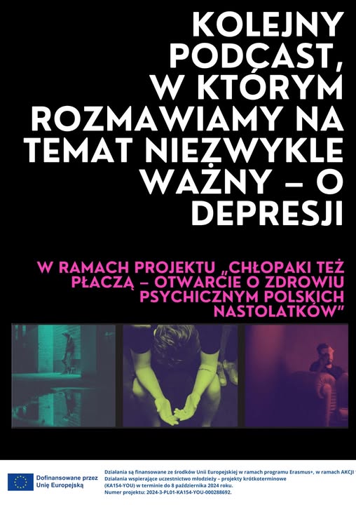 Młodzież realizująca projekt „Chłopaki też płaczą – otwarcie o zdrowiu psychicznym polskich nastolatków” nie zwalnia tempa i coraz głośniej i odważniej zwraca uwagę rówieśników na problemy zdrowia psychicznego. Od początku roku szkolnego chłopacy z grupy projektowej przygotowali serię podcasów dot. różnych problemów związanych właśnie z emocjami, zdrowiem psychicznym, cyberzaburzeniami. Dzisiaj zachęcamy Was do wysłuchania materiału poświęconego depresji – to mądry i wartościowy podcast. Dziękujemy